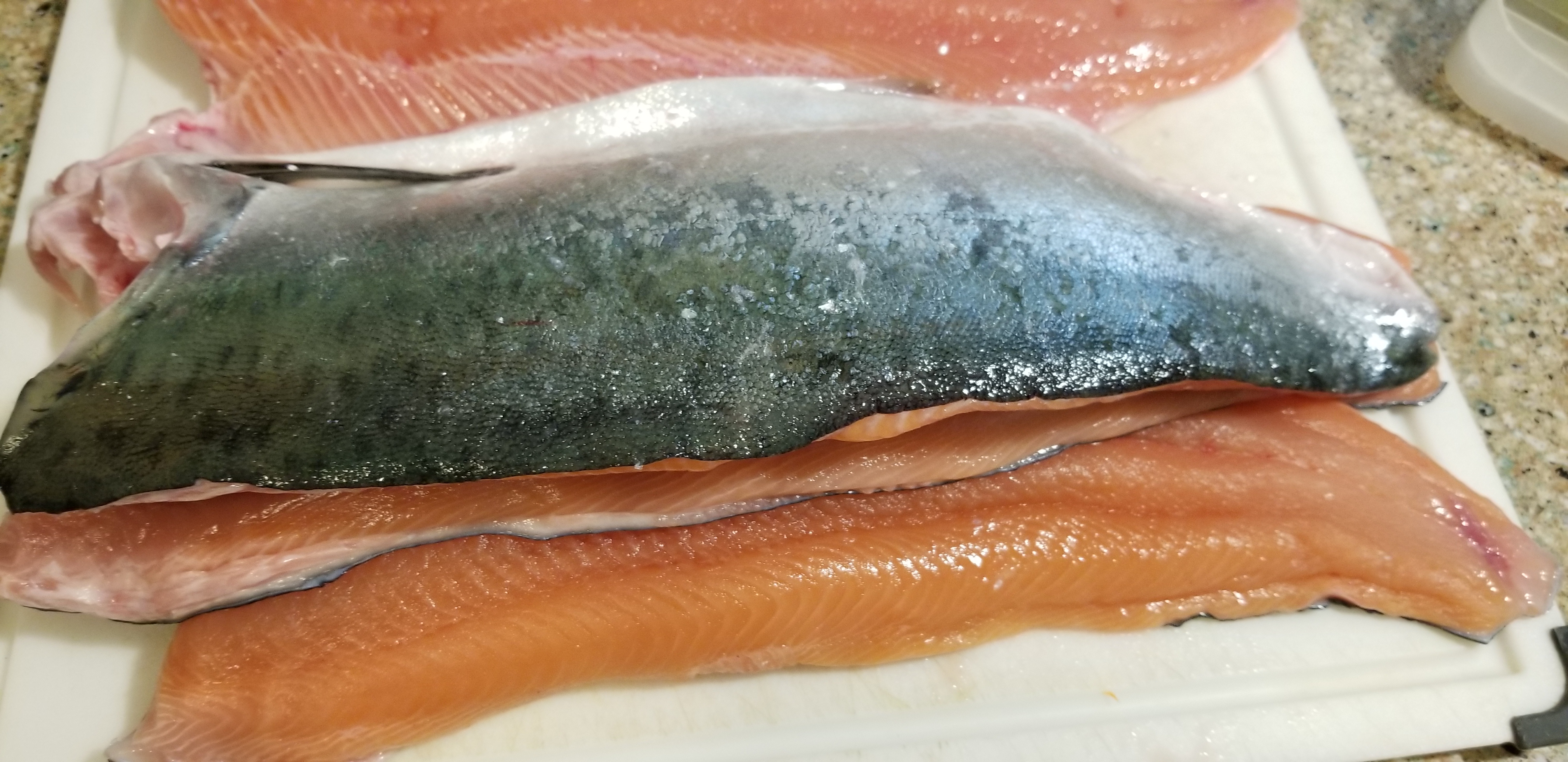 여름 휴가때 아들네 식구 부부와 두 아들 4식구가 여름 휴가때서북북에 있는 에스토리아 에 있는 컬럼비아강에서 낙시로 건져올린 고기란다.배를 빌려 타고나가 잡은 (Salmon) 연어를 6 마리나 잡았다고..그곳에서 휠렛도 떠서 우리집에 두마리 4 쪽을 건네주었다 컬럼비아강이 흘러 태평양 바다와 만나는 아주 크로 유명한 강이다.그리고 연어들이 밀물에서 알을 낳아 바다로내려가 지내다 다시 거꾸로 강을 거슬러 오르는 연어들의 숙명바다에서 강으로 올라가는 시기는 9.10.11월이 씨즌이라고 한다.산란을 위해 온몸에 상쳐를 입으면서도 ....자연의 섭리이니 어찌할꼬.. 낙시만 느리면 막 올라온단다 그러나 킹 살몬은 잡혀도 놔 주어야 한단다면허있는 사람 만이 허락한다나.. 살몬 요리할때 잊어버리고 사진을 찍지 못했..